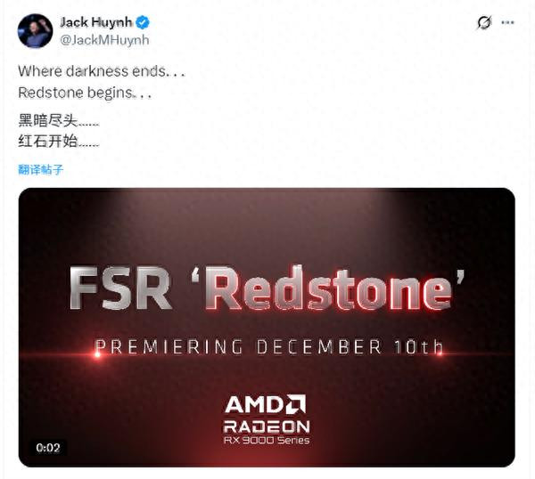快科技11月20日消息,AMD计算与图形事业部高级副总裁兼总经理Jack Huynh在社交媒体上发布官方预告,确认FSR Redstone更新已准备就绪,并定于12月10日正式发布。